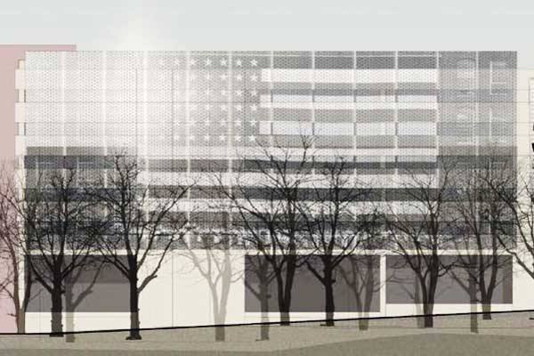 Proposed sketch of the garage with the historic Millyard flag image as seen by the Heritage Commission.