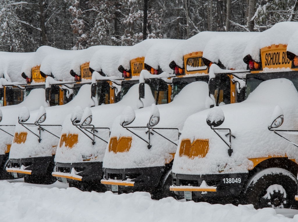 The buses at Student Transportation of America in Merrimack remained snow-covered Tuesday, waiting to be cleared off from the heavy snowfall.