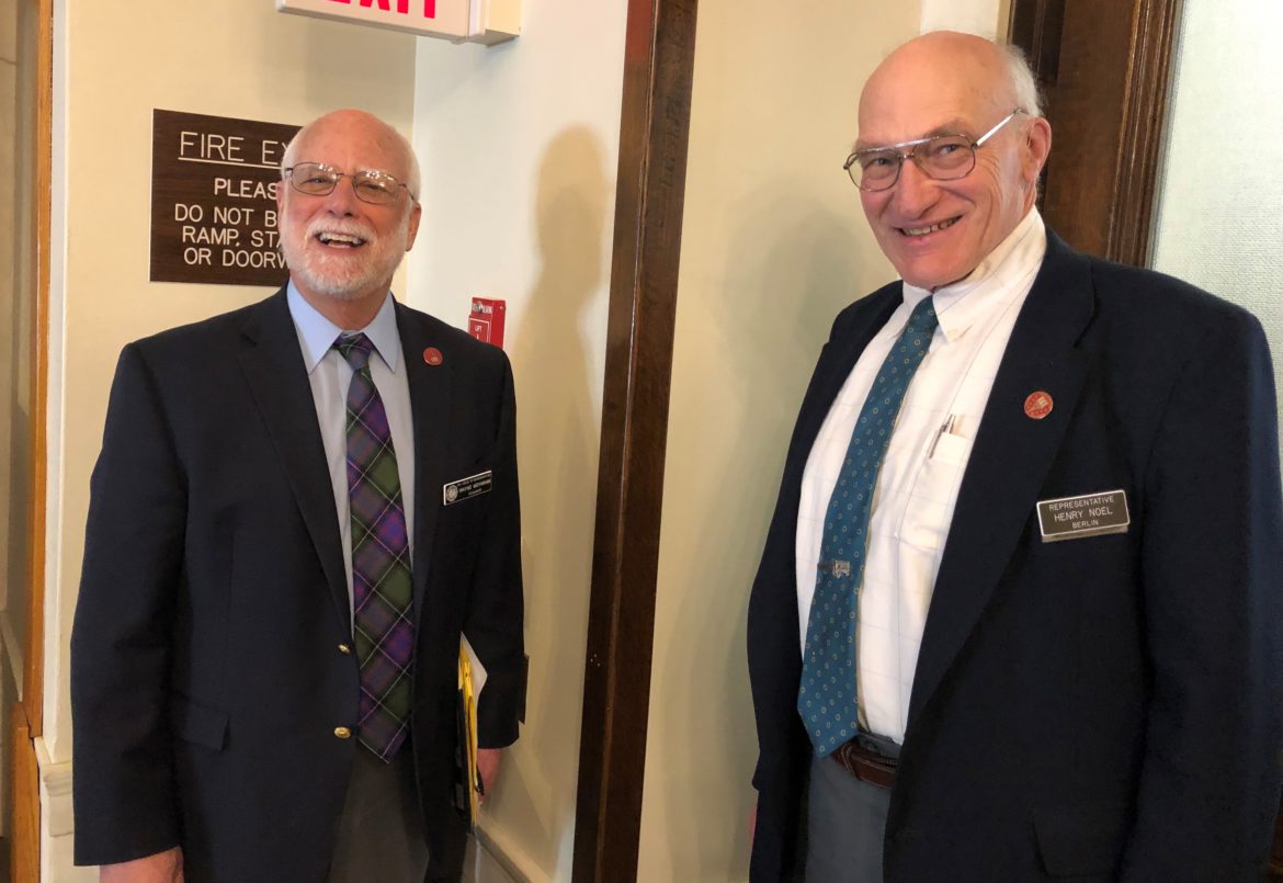 State Rep. Wayne Moynihan, D-Dummer, and Rep. Henry Noel, D-Berlin, confer before afternoon House session Wednesday. Photo/Paula Tracy