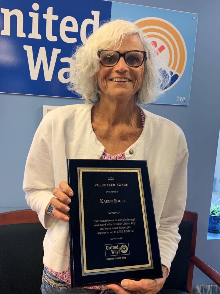 “We are so fortunate to have incredible volunteers, and this year we are proud to recognize Karen Soule with the VOLUNTEEER Award in our Southern Region,” said Patrick Tufts, President and CEO of Granite United Way. “Karen’s volunteerism across the community, her commitment to education and the way she served as an active part of the Fuel our Families program are just a few things that illustrate the positive impact she is making.”