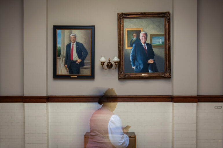 A woman moves past a portrait of former Mississippi governor Haley Barbour (right) at the Mississippi State Capitol in Jackson, Miss. on Jan. 30, 2024. Rory Doyle for The New York Times