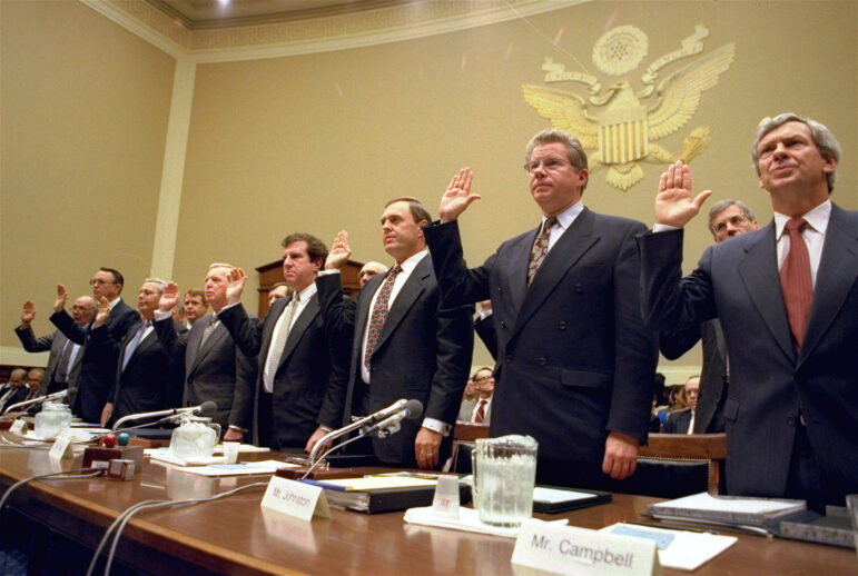 FILE – In this Thursday, April 14, 1994 file photo, the heads of the nation’s largest cigarette companies are sworn in before a hearing of a House Energy subcommittee which was holding hearings on the contents of cigarettes on Capitol Hill in Washington. More than 40 states brought lawsuits demanding compensation for the costs of treating smoking-related illnesses. Big Tobacco settled in 1998 by agreeing to pay about $200 billion and curtail marketing of cigarettes to youths. From left are Robert Sprinkle III, executive vice president for Research American Tobacco Co.; Donald Johnston, American Tobacco; Thomas Sandefur Jr., Brown and Williamson Tobacco Corp.; Edward Horrigan Jr., Liggett Group Inc.; Andrews Tisch, Lorillard Tobacco Co.; Joseph Taddeo, U.S. Tobacco Co.; James Johnston, RJ Reynolds; and William Campbell, Phillip Morris USA. (AP Photo/John Duricka)