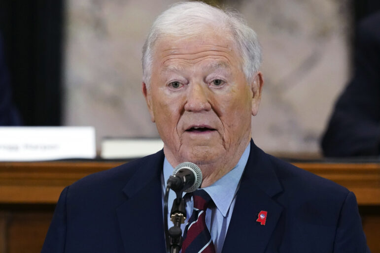 Former Republican Gov. Haley Barbour introduces Republican presidential candidate, author and former Vice President Mike Pence, Saturday, Aug. 19, 2023, at the Mississippi Book Festival in Jackson, Miss. Pence was one of several dozen authors who participated in a variety of panels or sit-down interviews for festival attendees. (AP Photo/Rogelio V. Solis)
