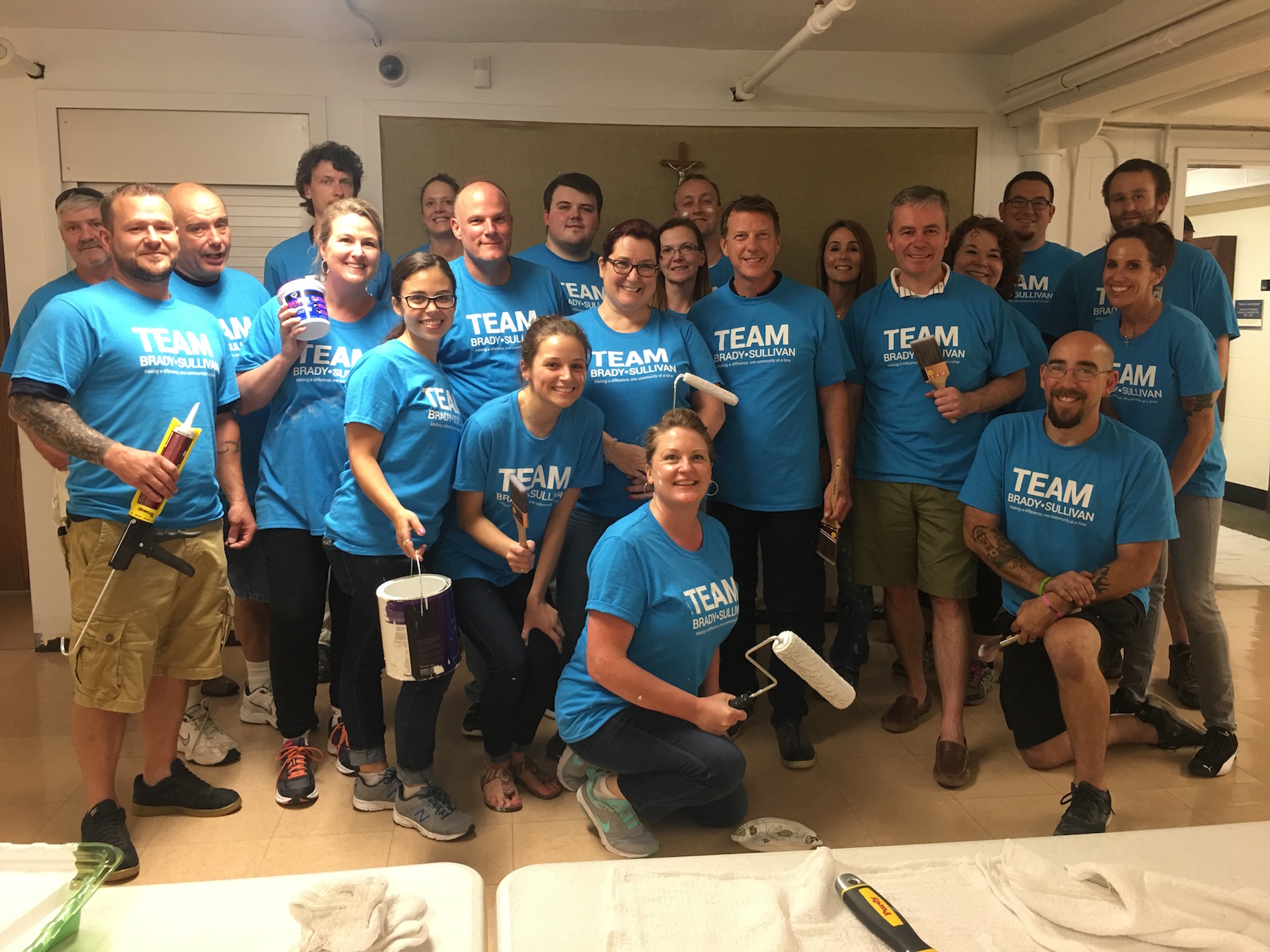 Nearly 50 Brady Sullivan employees volunteered in collaboration with Home Depot, Mohawk Flooring and TF Andrew flooring installation experts, to repaint the hall and install over 4500 square feet of new vinyl plank flooring in the Cathedral hall.