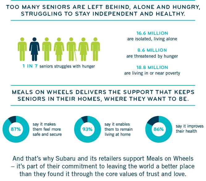 By purchasing or leasing a new Subaru during the Subaru Share the Love Event and selecting Meals on Wheels as your charity of choice, you can help deliver nutritious meals and other important services to seniors right here in Hillsborough County.