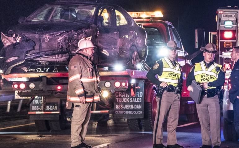 State Police at the scene of Saturday’s fatal accident on the Everett Turnpike. Photo/Jeffrey Hastings