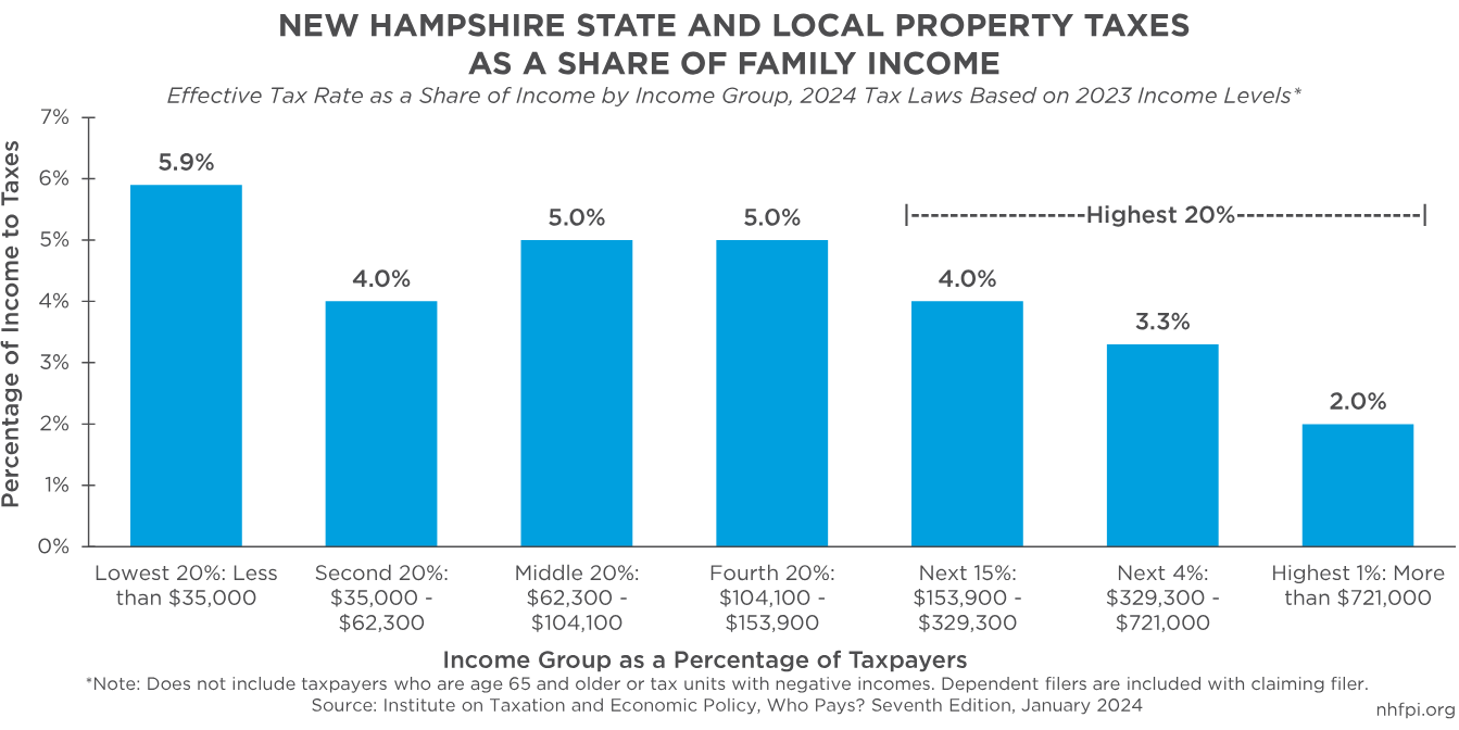 While refund rates are low in comparison to the amount paid in property tax, the program helps offset costs for homeowners with low and moderate incomes who typically pay a greater percentage of their income in property taxes relative to homeowners with higher incomes. According to the Institute on Taxation and Economic Policy, Granite Staters under 65 years old with incomes between $62,300 and $153,900 paid about 5.0 percent of their income in state and local property taxes in 2023. This percentage was higher among those with incomes below $35,000, who paid approximately 5.9 percent. The highest one percent of households by income, with more than $721,000 annually, paid about 2.0 percent of their incomes in property taxes.
