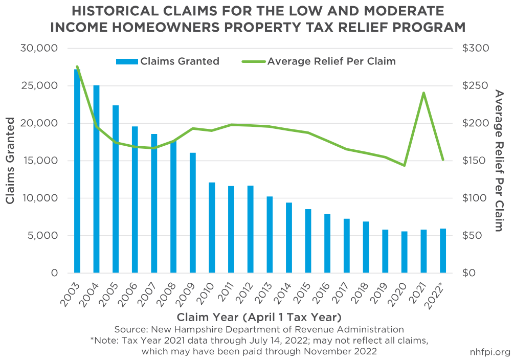 Although there has been an increase in program participation over the last few years, the number of claims granted had been on a steady decline from its peak of 27,208 in 2003, the first year of its implementation. A total of 5,943 claims were granted for 2022 as of July 2023 data, which is a slight increase from the total number of 5,821 claims in 2021. Despite this increase, the total amount of relief paid has declined to about $900,000 in 2022 after spiking to approximately $1.4 million the prior year. In 2021, the average relief amount per claim was $240.51, which is the highest it has been since the average relief amount was $275.65 in 2003, unadjusted for inflation. Thus far, the average relief amount was $151.44 in 2022, which may fluctuate as claims continue to be processed and paid in 2023. While homeowners with low and moderate incomes have benefitted from the program, renters, who have substantially lower median incomes, are not eligible for relief. As of 2022, the median household income for renters was about $56,000 while homeowner median income was approximately $108,000.