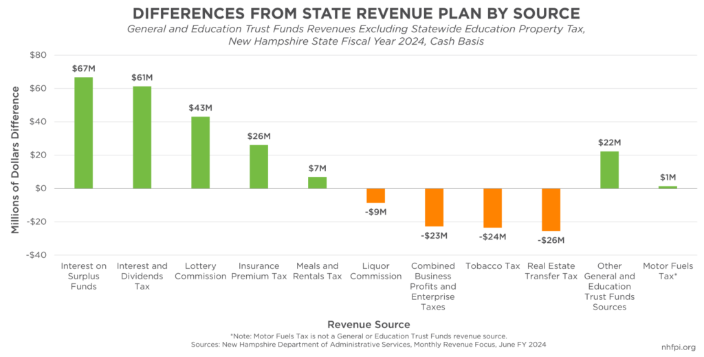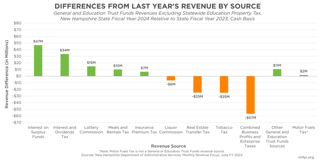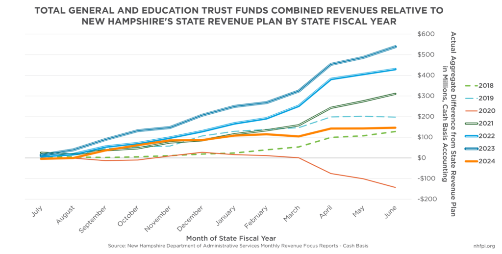 New Hampshire State revenues ended State Fiscal Year (SFY) 2024 in June with receipts slightly above expectations, but below the prior year, for the month. Overall, the Stateโs combined General and Education Trust Funds surplus for the total of SFY 2024 held at $146.5 million, or 4.6 percent, above the State Revenue Plan on a cash basis. However, about 87 percent of that total surplus amount was generated by two revenue sources that are likely to disappear in future years.