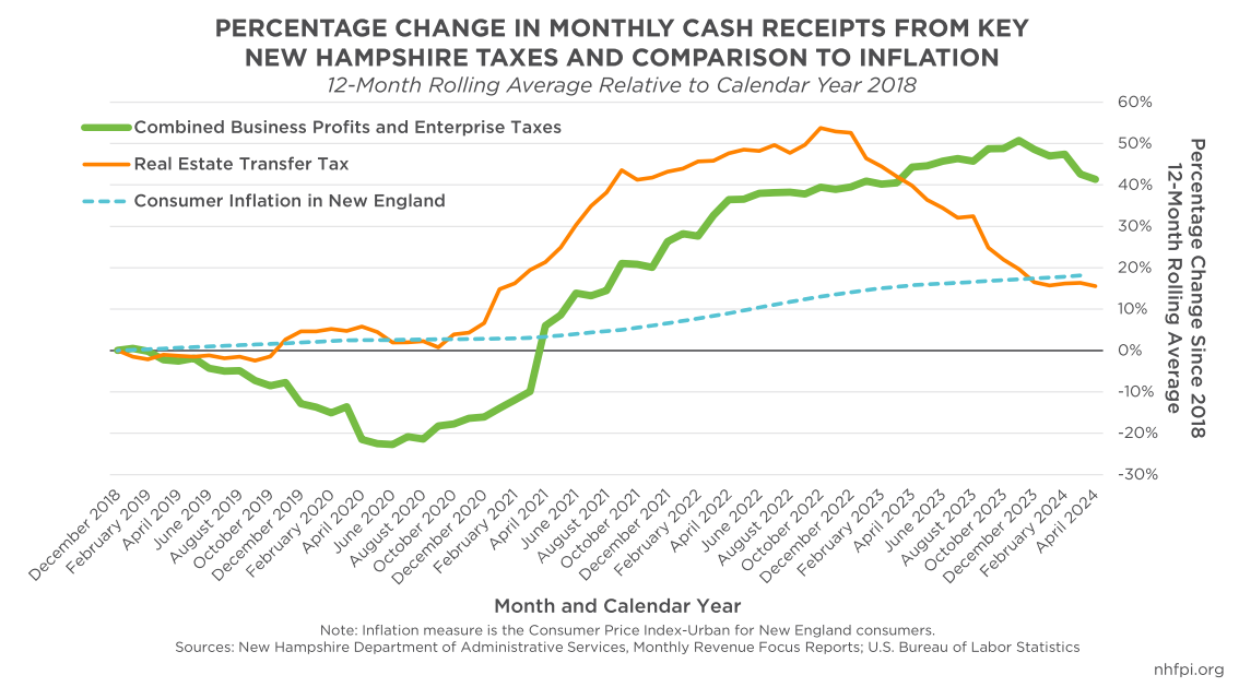 Business tax revenues may be weaker for several reasons, some of which could have long-term consequences. Corporate profit growth accelerated quickly and robustly following the initial months of the COVID-19 pandemic in the United States. The largest 120 New Hampshire BPT filers paid 42.6 percent of all BPT revenue collected in Tax Year 2021, currently the most recent year for which data are published. Complex, multi-component entities that likely straddle state and national borders paid more than half of BPT collections. National corporate profits likely reflect trends among BPT payers, and New Hampshireโs corporate tax revenue growth lagged behind growth in other statesย during the 2015 to 2022 period. Those overall national profits slipped in late 2022 and early 2023 before growing again in late 2023. Some of that reduction likely impacted New Hampshireโs BPT returns in April, and may suggest more limited growth to come. The quarterly tax estimate payments for the first quarter of 2024, which were due along with 2023 returns or extension payments for the approximately 90 percent of businesses that use a calendar year for their tax year, were about 9 percent lower than the same period in 2023, suggesting businesses anticipated less taxable economic activity in New Hampshire this year.