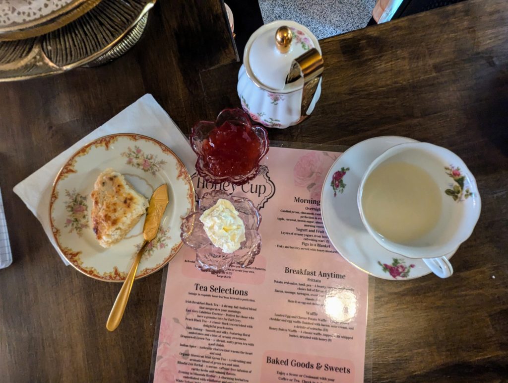 And she has also started exercising her Great British Baking skills, making simple scone recipes, served quite properly, with your choice of clotted cream and jams, which are featured on the menu along with a selection of light fare including yogurts, egg dishes, waffles, salads and more. And yes, you can get coffee, if you prefer.