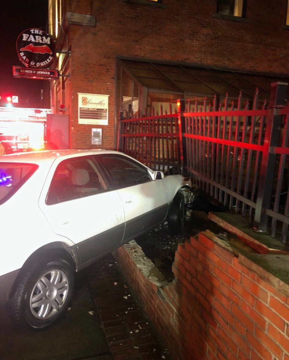According to the police dispatch log, at 3:24 a.m. a hit-and-run accident resulted in a car crashing through the exterior surround of the rear patio at The Farm Bar & Grille, 1181 Elm Street.