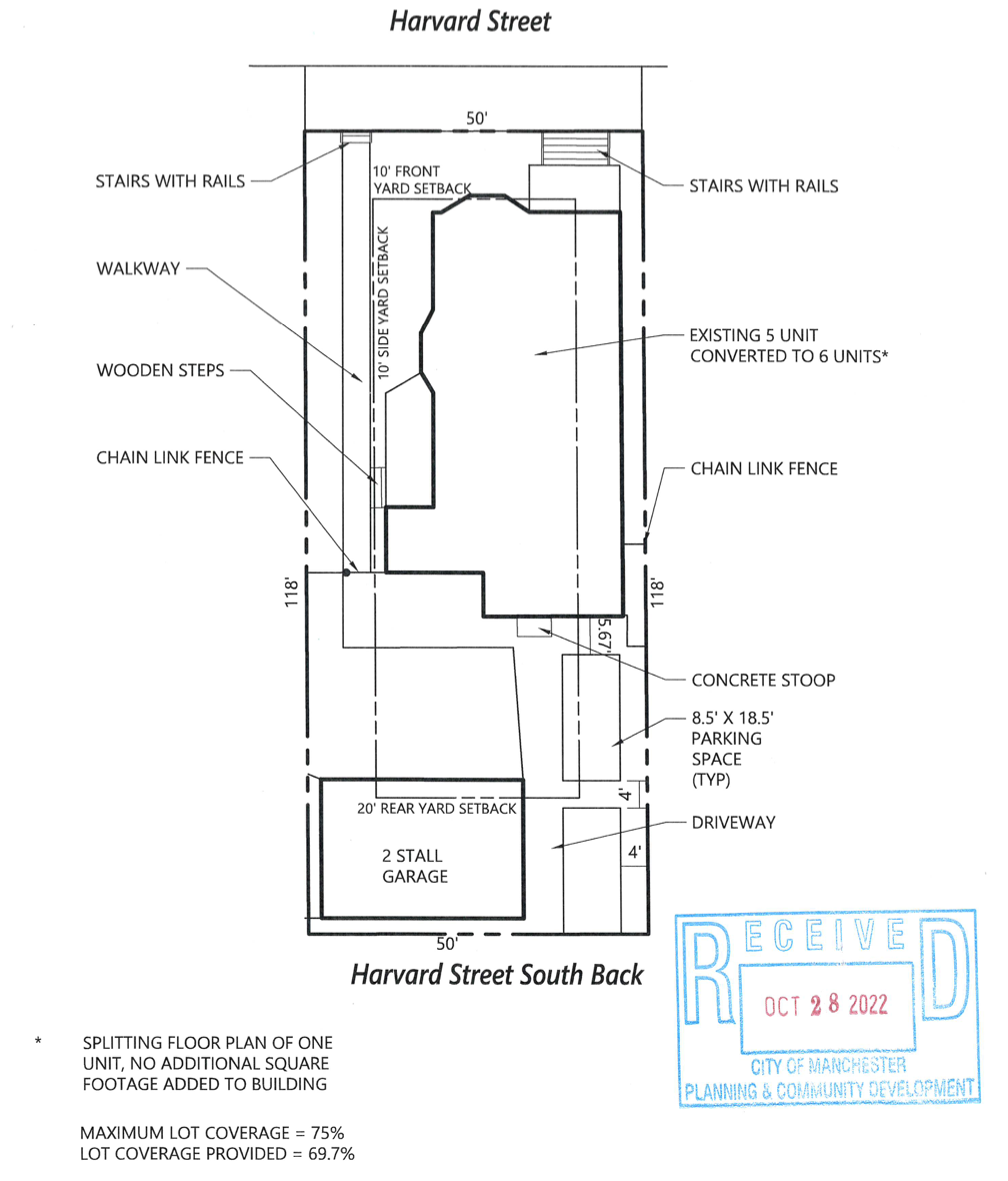 Applicant has submitted an application to subdivide an existing 19,857 SF lot of record, resulting in two lots of 9,738 SF (Lot 6) and 10,119 SF (Lot 6A) lot.