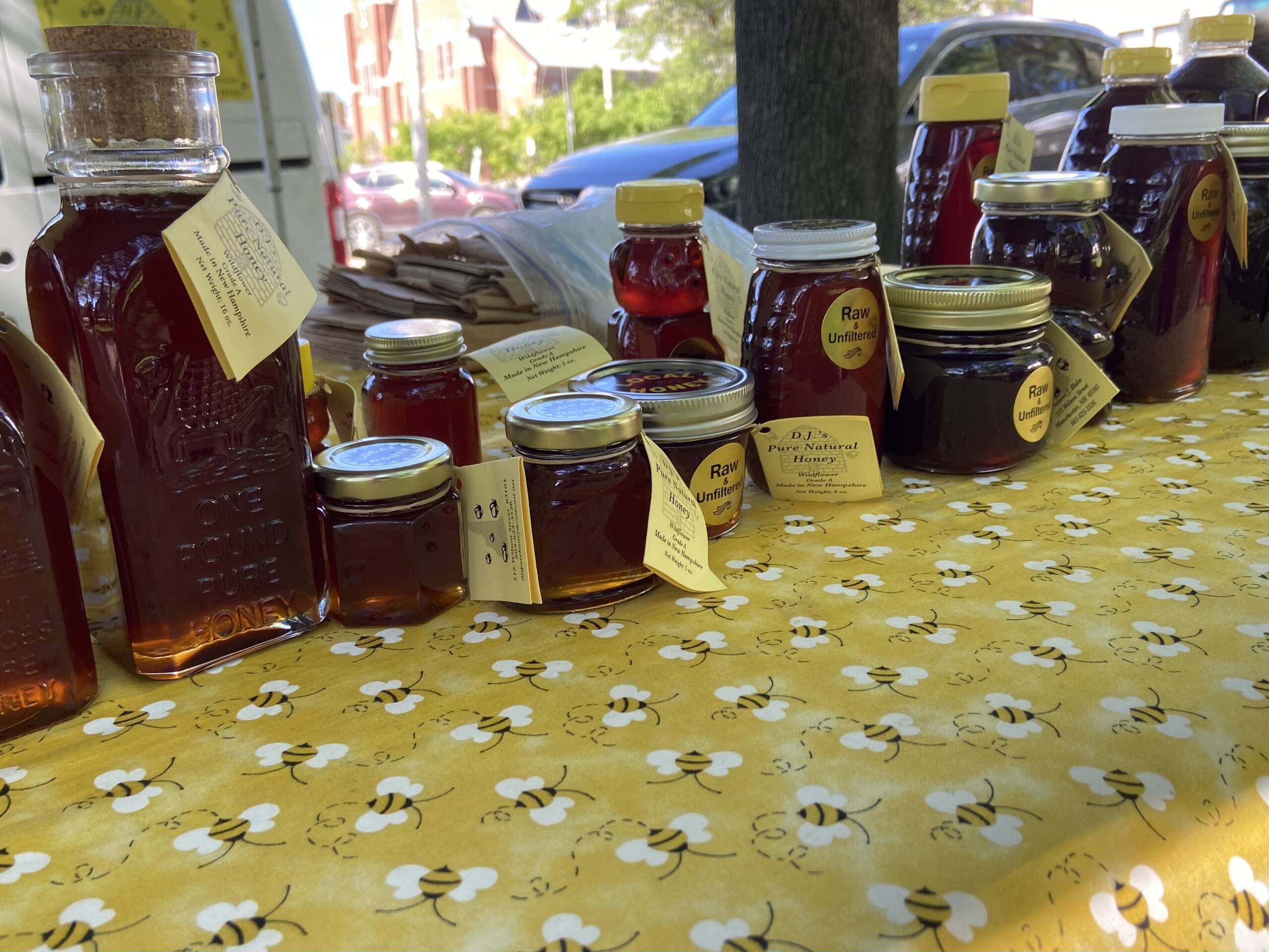 Some vendors such as DJโs Pure Natural Honey have been coming to the Intown market for years. John Blake, who is a beekeeper, said he has hives in Mason, New Boston, and Manchester to produce wildflower honey for DJโs. Some of DJโs honey is even infused with hot peppers.