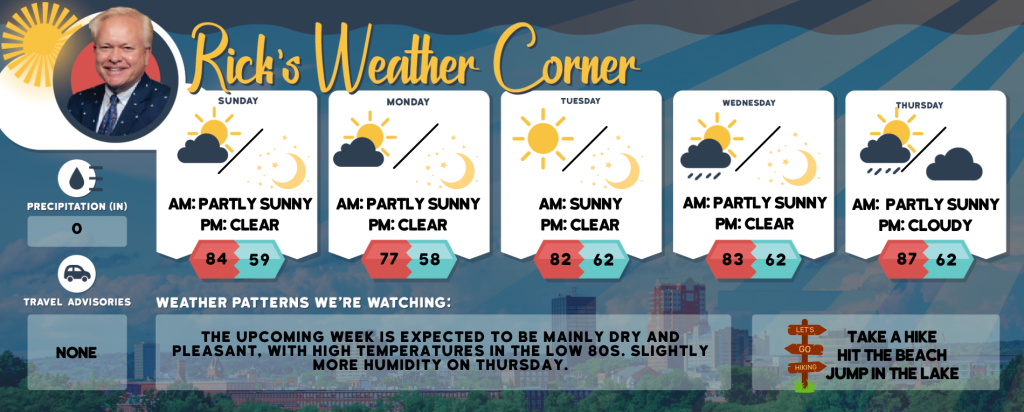 The upcoming week is expected to be mainly dry and pleasant, with high temperatures in the low 80s. Slightly more humidity on Thursday.