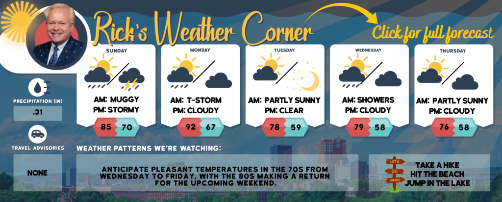 Monday: Some sun, hot, and humid with some spotty thunderstorms in the afternoon. High 92 (feel like 96) Winds: WSW 10-15 mph