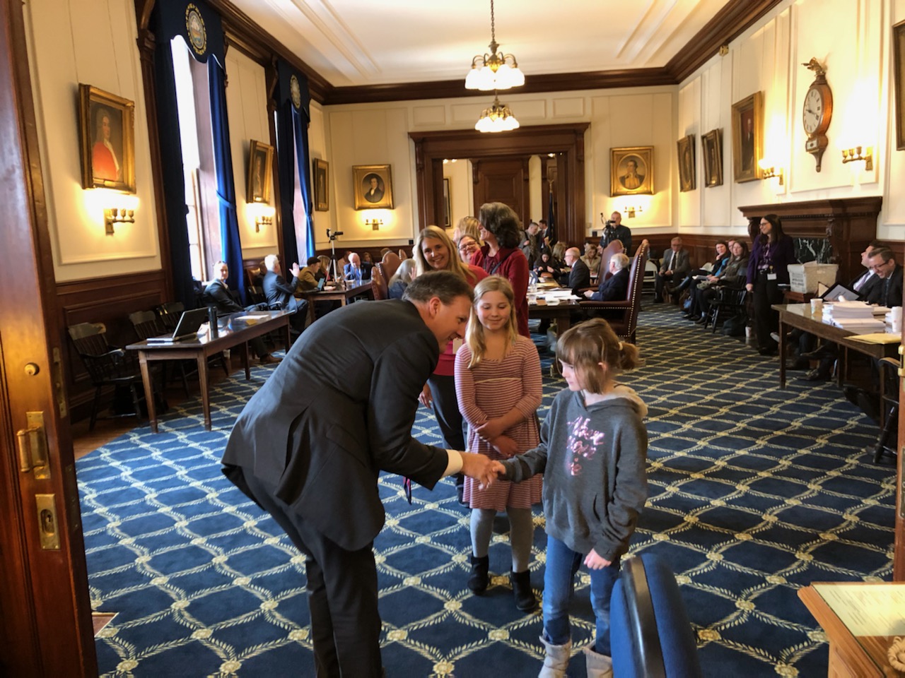 Students from the Swasey Central School in Brentwood shook hands with Sununu, and just as he has done throughout his tenure, the governor bent down, looked each child in the eye, shook hands and asked for their name.