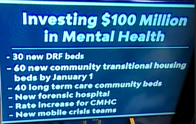 He said there are now 30 new beds at designated receiving facilities across the state, 60 new community transitional housing beds by Jan. 1, 40 long-term care community beds opening up, a new forensic hospital to be built, rate increase for mental health workers, and new mobile crisis teams to help those in a mental health care crisis.