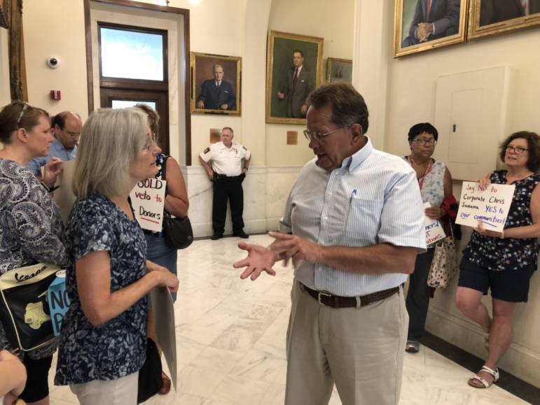 Protesters holding signs outside of the closed-door meeting sang Pete Seegerโs โEverybodyโs Got a Right to Live…โ and asked whether the governor is for the people or for big business.
