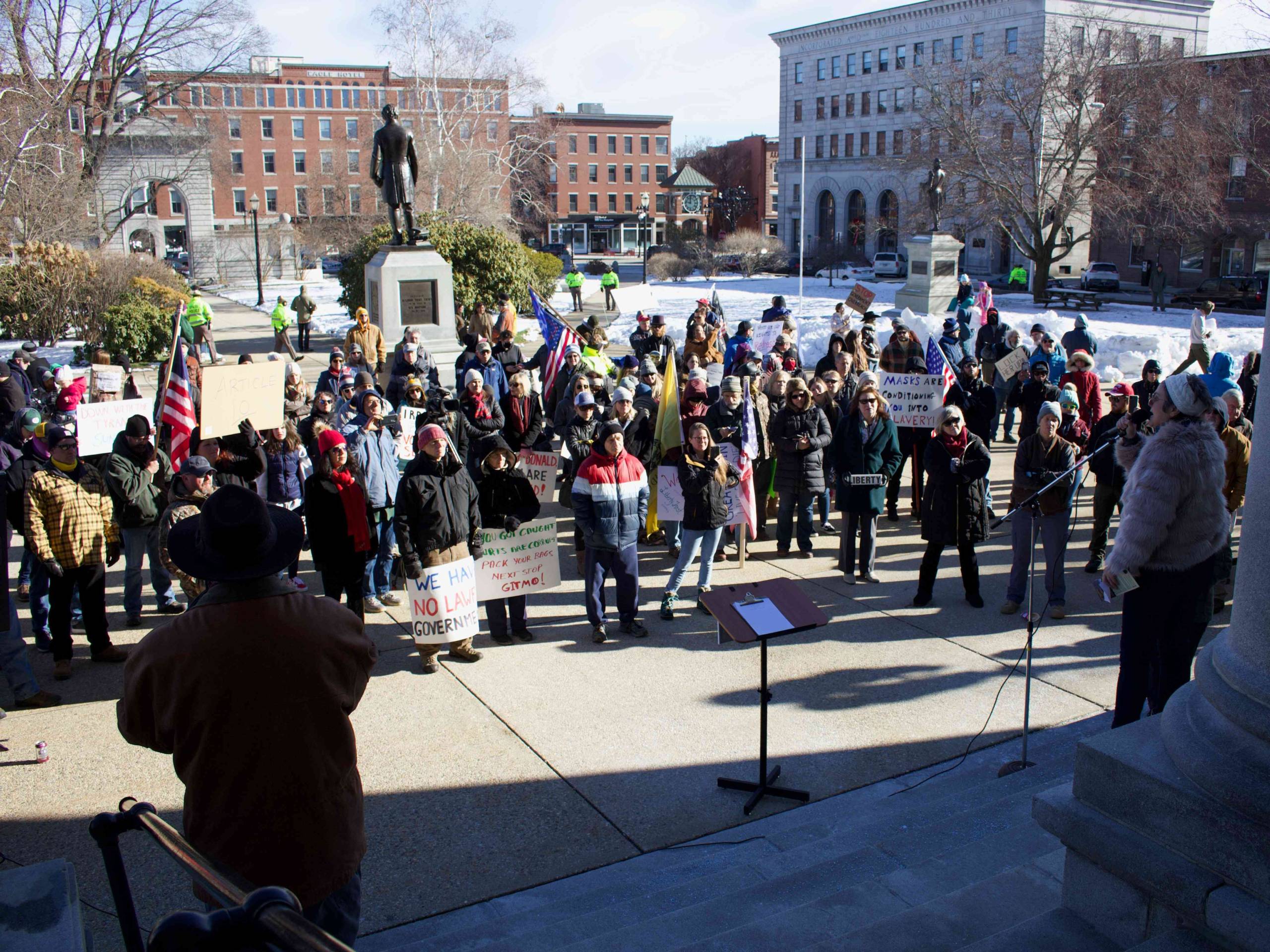 Maskless protestors who oppose Sununuโs statewide mask ordinance and what they call his “unconstitutional emergency orders” to curb the spread of COVID-19 gathered outside the State House during the ceremony. Crowd estimates ranged from 100 to 200 people protesting.