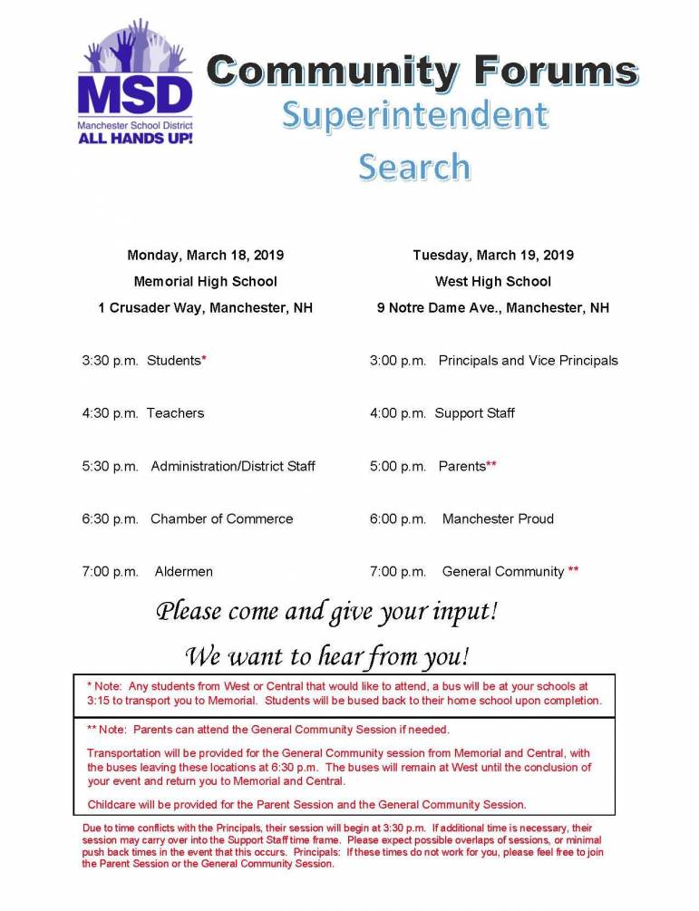 MANCHESTER, NH โ€”The Board of School Committee invites the Manchester community to attend one of the Superintendent Search Community Forums.
