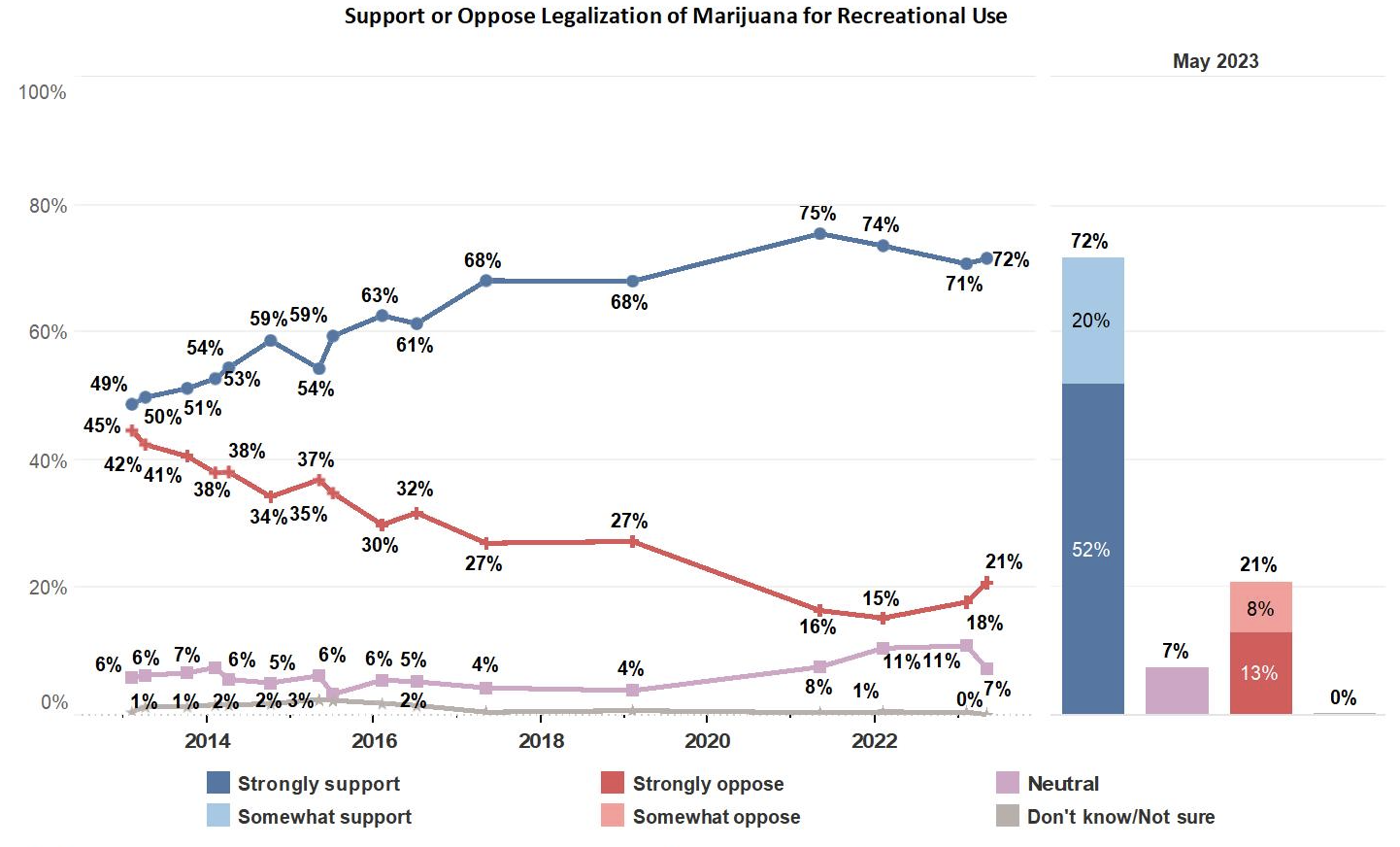 After the failure of a bill in the State Legislature, New Hampshire remains the only state in New England which does not allow the sale of marijuana for recreational use. Despite the unwillingness of the Legislature to pass a marijuana legalization bill, 72 percent of Granite Staters strongly (52%) or somewhat (20%) support legalizing marijuana for recreational use, 21% are somewhat (8%) or strongly (13%) opposed, 7% are neutral on the issue, and less than 1% are unsure.