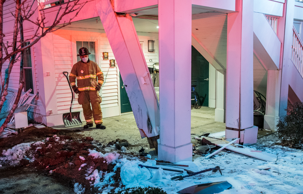 MANCHESTER, NH โ A BMW struck a building at 11 Temple Ct. damaging the posts that support a large balcony that allows entry to second-floor apartments. It appears the SUV lost control in the parking lot.