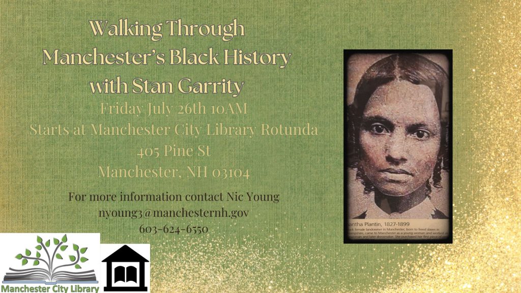 MANCHESTER, NH โย Manchester City Library invites you to join in a walking tour presented by local historian Stan Garrity on Friday July 26 at 10 a.m. The walk will begin in the Main Libraryโs rotunda and will follow Stanโs guided tour before returning to the library. Come learn about the woman who turned her house into a stop on the Underground Railroad, the first Black woman to graduate from Manchester High School, and much more!