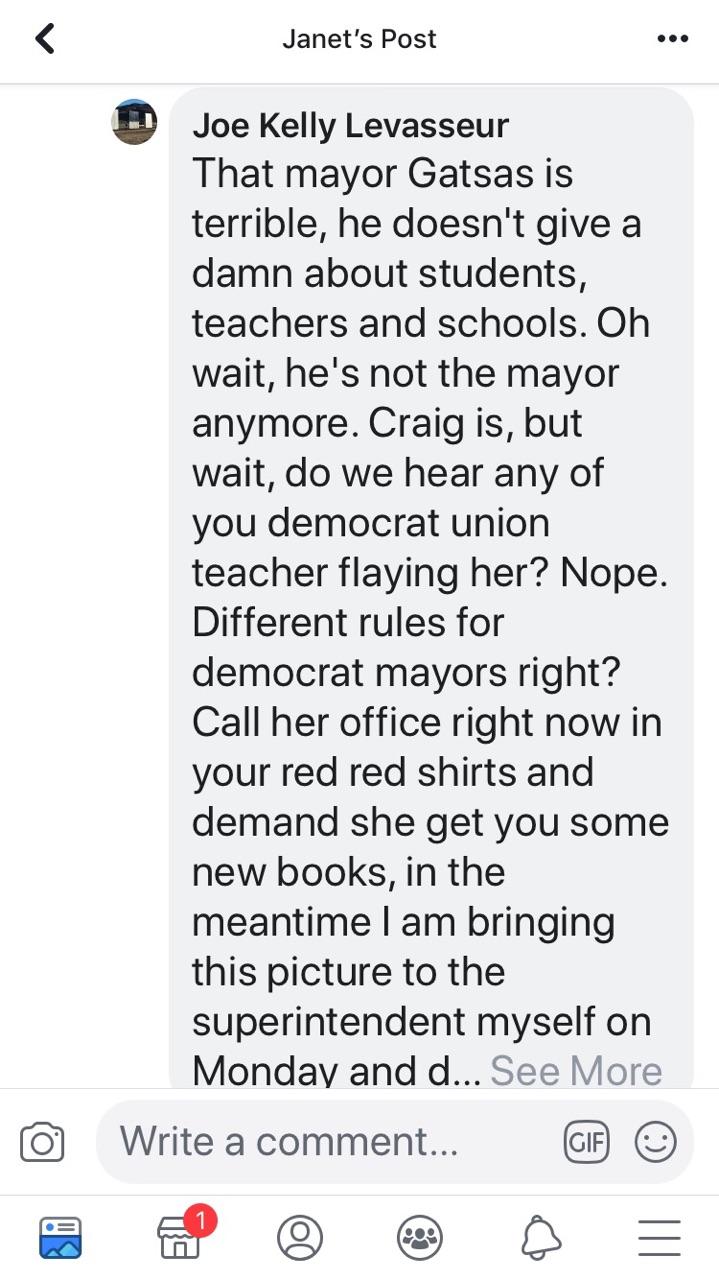 “These posts turn off anyone thinking about putting their kids in our schools. Imagine any private employee posting things like this and keeping their job?” wrote Levasseur, who, the next day, apparently followed through on his promise to personally bring the photo to the attention of Superintendent Dr. Bolgen Vargas.