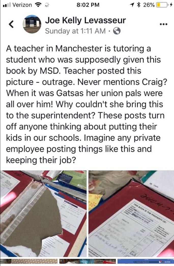 “My whole reasoning behind posting the photo is that our students in Manchester deserve better.ย Theyโre being compromised.ย What kind of a message are we giving students if we hand them a text-book of curriculum theyโre going to be responsible for that school year when it looks like this,” Beauparlant said.