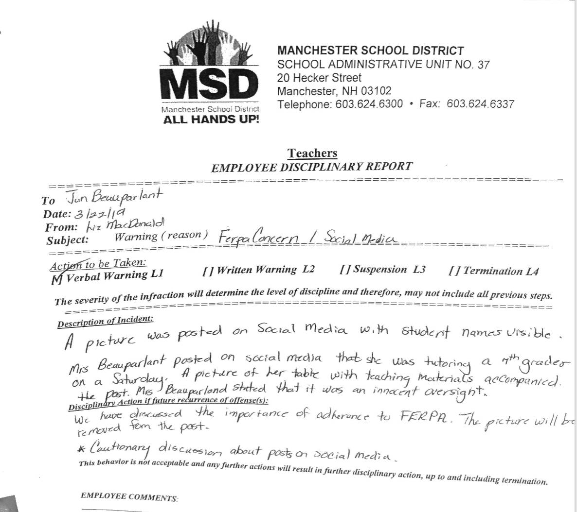 Janet Beauparlant submitted a letter on April 23 to the Mayor and Board of Aldermen describing a situation that unfolded on Facebook March 10, and ended with her first disciplinary letter in 34 years of teaching.