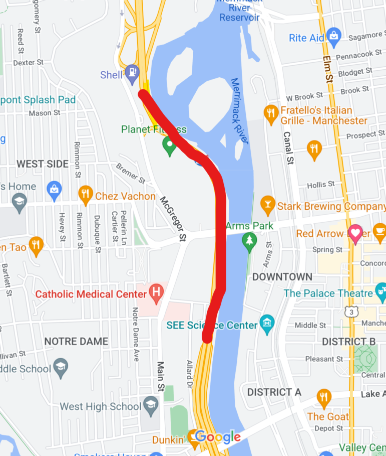 The New Hampshire Department of Transportation (NHDOT) announces plans to temporarily close the right lane to inspect a sewer line, on the southbound barrel of I-293 in Manchester, on Thursday evening, September 22, 2022 from 7 pm to midnight. The sewer pipe is located between Exits 6 and 5 and the work zone will not impact any on or off-ramps in the area.