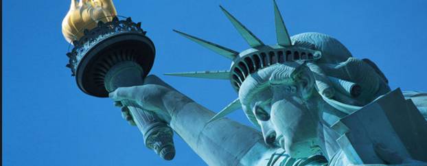 In her left arm Lady Liberty clutches the Declaration of Independence. In her right hand she holds aloft a torch, a lighthouse beacon for those seeking a safe harbor. On her head she wears a crown with seven radiant points that symbolize the seven continents of the world.