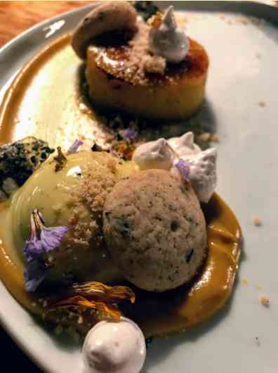 Dessert at Dahlia is no less adventurous and captivating than the courses that precede it. Foster-Berryโs experience as a pastry chef shines through in sweets such as golden milk panna cotta with chai shortbread, turmeric-squash puree and honey meringue.