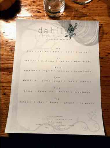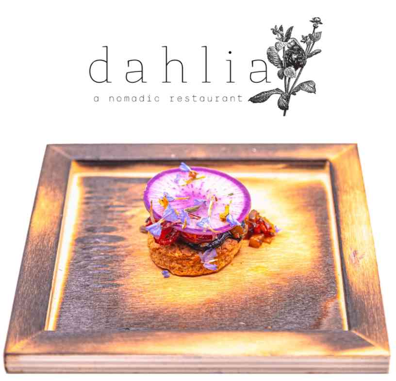 Attending a Dahlia event is a whole experience that differentiates from eating a meal at a traditional brick-and-mortar restaurant. Guests are presented with a menu that is intentionally minimalist; each item is described as a list of ingredients, with no indication of how theyโre prepared