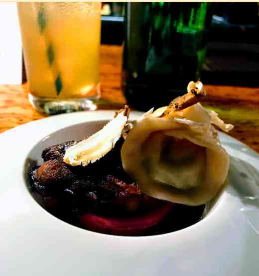 A personal favorite of Berry was the Venison Tortellini from their second dinner at The Birch on Elm. The course consisted of sourdough tortellini filled with venison-mushroom sausage with radish in a shallow bowl of venison bone broth.ย