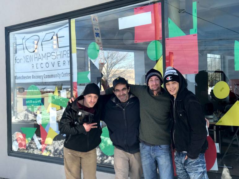 Manchester residents Adam Dube, Carlos Zamban, Jason Barrows, and Anthony Simms visit the Hope for New Hampshire Recovery center for group meetings and community support. Photo/Erica Swallow