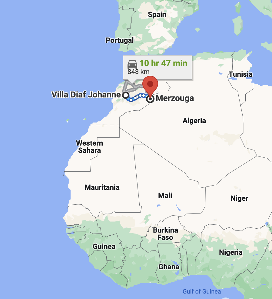 Leaving the airport, I relied on Google Maps to get me to the villa where I was spending my first night. This worked fine getting me eastward out of Marrakesh, despite the gnat-like presence of bicycles, motorcycles and horse-drawn carts. After 45 minutes, I turned off the highway, with two kilometers to Villa Diaf Johanne. I drove slowly with an irrigation ditch on my right-hand side and beautiful greenery all around me. Sure enough at two kilometers, although I saw nothing like a villa, Google Maps told me I had arrived at my destinationโif I took a right turn. Into a ditch. Up to this point, Iโd obeyed my technological masters, but even I wasnโt going to fall for this trick. Had I learned nothing from Michael Scott on โThe Officeโ?
