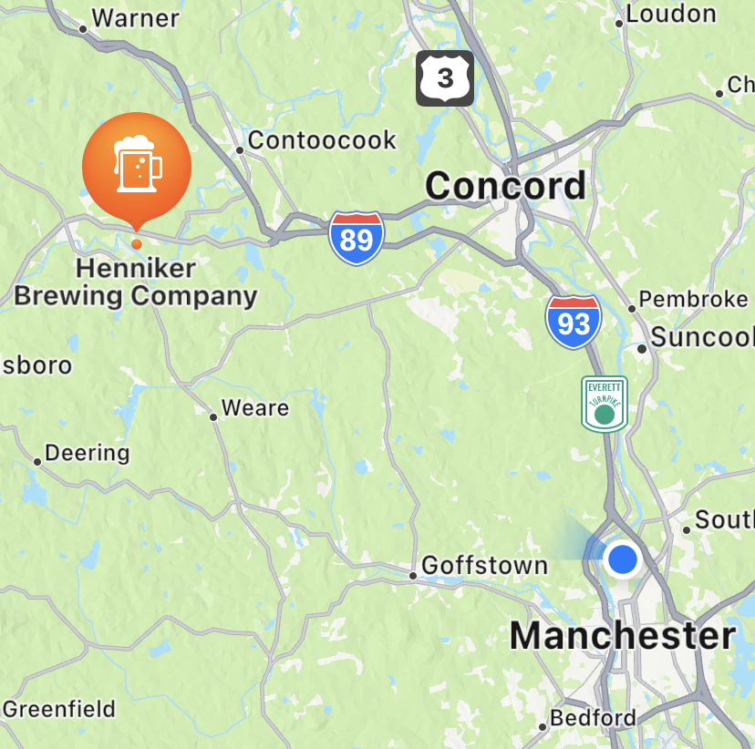 This time, Henniker Brewing Company, a scant 26 miles from Manchester. I always forget how close it actually is. Maybe it’s the dramatic difference between downtown Manchester, largest city in New England north of Boston, compared with downtown Henniker, which could easily be Stars Hollow. (Is my inner Gilmore Girl showing?) Or maybe it’s the gradually changing countryside, which goes from city to suburbs to widely spaced homes to farmland to wooded stony hillsides. In any case, the transformation provided by those 26 miles is always enjoyable.