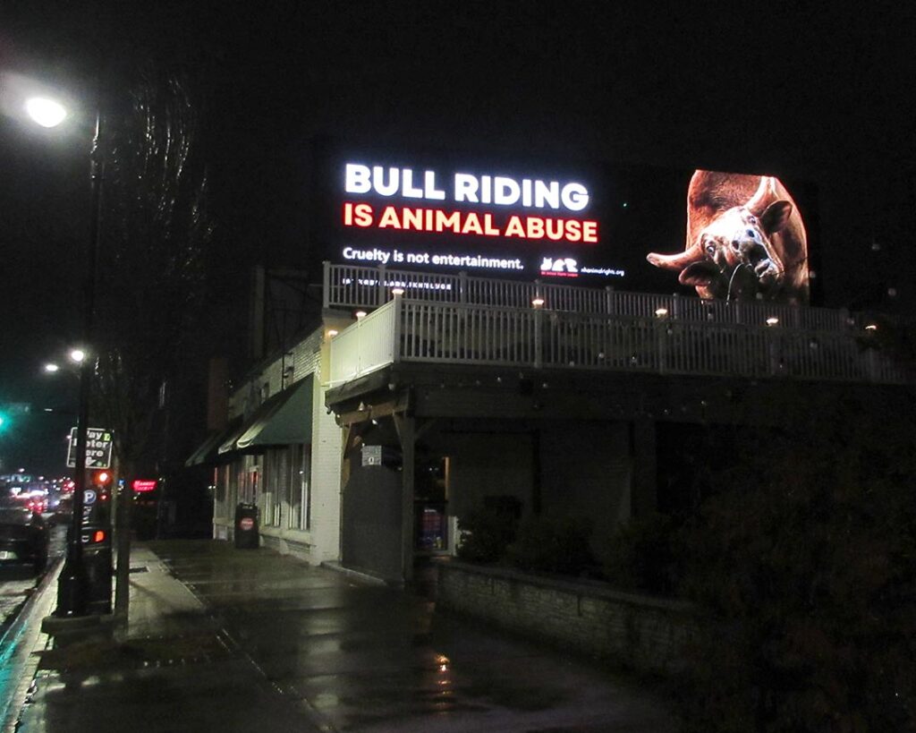 The NH Animal Rights League has a “Bull Riding is Animal Abuse” billboard on Elm Street near the arena, protesting this cruelty that is coming to Manchester, NH. Help the activists by showing up for their peaceful demonstrations.