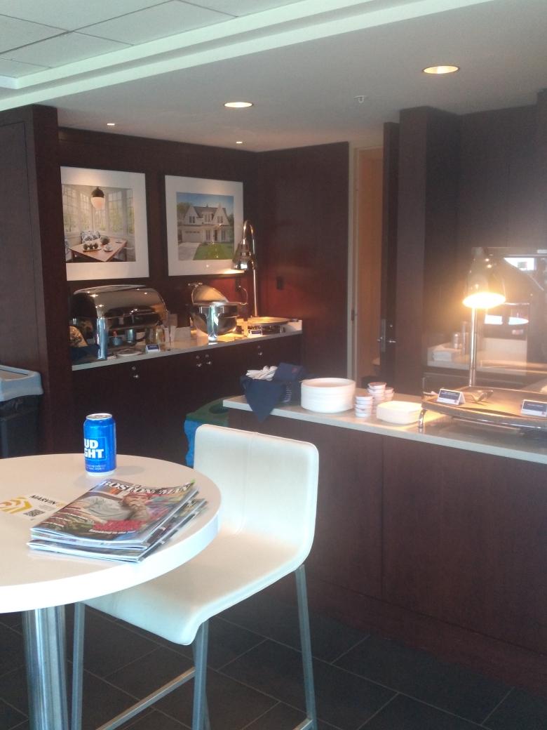 In the back of the suite was a dinette with a mini-fridge filled with free beer and wine, and on the counters sat rows of chafing dishes where the catered buffet would soon arrive, which included sausage and onions on bulky rolls, chicken tenders and hot dogs. Pizzas were then placed beneath heat lamps as other munchies abounded[11].