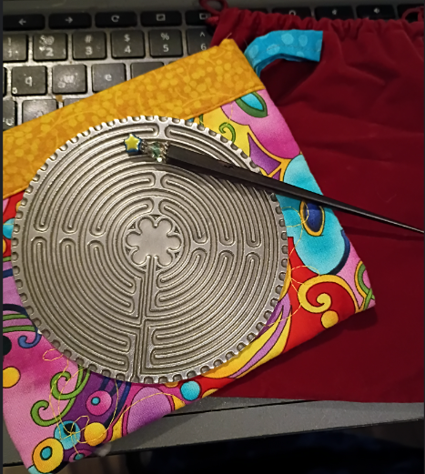 One day I was with my friend Mary Ann, who was with Judy almost every day until the end, and she handed me some of Judy’s things to lookย through to see if I wanted any of them. As I moved things around a little padded clutch caught my eye. I could tell it was one of Judy’s creations so I didn’t want it discarded; I was sure I could use it forย something. As I opened and unwrapped it I found this gorgeous miniature of the labyrinth of the Cathedral de Chartres in France. Judy was an avid creator and collector who was very proud of her French heritage. I have no idea where she got this but it’s been a genuine blessing to me ever since I first held it. I’ve “walked” this labyrinth more times than I can count. During times of stress, loneliness or confusion, especially in the middle of the night, this has been a wonderful tool to help me calm and center myself. It’s my own wonderful fidget toy left behind by a woman who was herself a whirling dervish of ideas and energy. And it’s more precious to me than I can express.