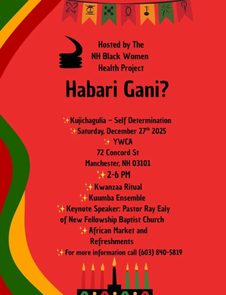 โKujichagulia โ Self-Determinationโ 2025 Kwanzaa Celebration, YWCA, Manchester, NH โ NH Black Women Health Project hosts the 2025 Kwanzaa celebration at the YWCA at 72 Concord Street, this Saturday, Dec. 27 from 2 pm – 6 pm, Downtown Manchester, NH. Beginning with an African Market where you can pick up information and items for you, family, and friends, followed by Explanation of Kwanzaa, Kwanzaa Ritual, Kuumba Ensemble, and Community presentations by Dr. Adine Latimore National Council of Negro Women, Sister Shirley Tomlison, MA Community Engagement & Outreach Specialist and Keynote Speaker, Minister Ray Ealy, New Fellowship Baptist Church. More info here.