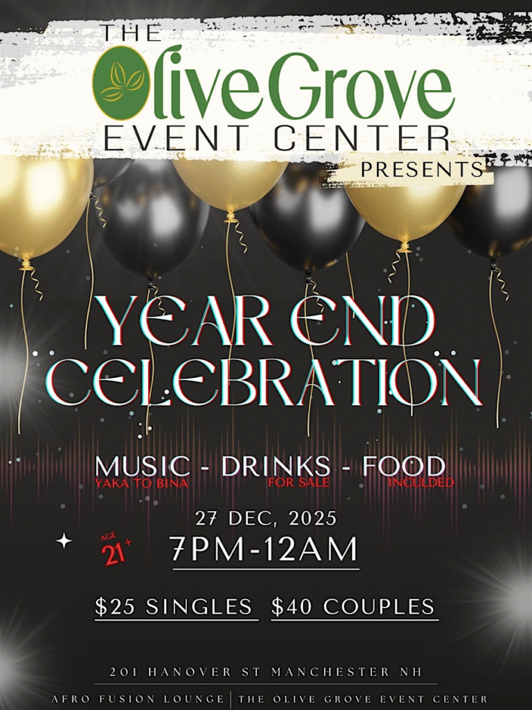 Year End Celebration, The Olive Grove Event Center, Manchester, NH โ Come Experience the Dopest Vibe of the New Spot Afro Fusion Lounge this Saturday, Dec. 27 from 7 pm – 12 am. $25 for Single and $40 for couples. Drinks will be on sale and food comes with your entry ticket. Best DJs for oldies and newbies Vibes. ALL NIGHT PARTY. Get tickets here.