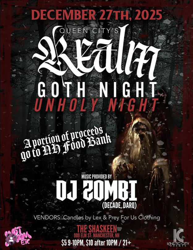 Queen City’s Realm Goth Night: Unholy Night, The Shaskeen Pub & Restaurant, Manchester, NH โ GOTH NIGHT RETURNS! Join us for Goth Night this Saturday, Dec. 27 from 8 pm – Midnight at The Shaskeen! Because of the holidays and the recent issues happening with SNAP we will be donating a portion of the proceeds to the NH Food Bank.