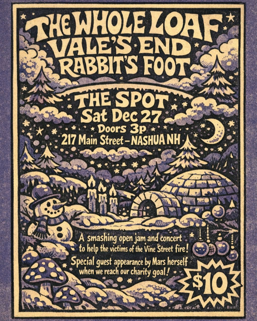 Vine Street Benefit Open Jam & Concert, The Spot, Nashua, NH โ Join The Whole Loaf, Vale’s End, and Rabbit’s Foot right after Christmas for a charity show and open jam meant to benefit our friends who lost their studios and the families who lost their apartments in the Vine Street fire. We’re going to be running a wild show with three great bands, sandwiched between two open jams! Come down and show your support for the community this Saturday, Dec. 27 from 4 pm – 1 am – and have a great time! If we raise enough moneyโฆ Mars herself will perform a set! More info here.