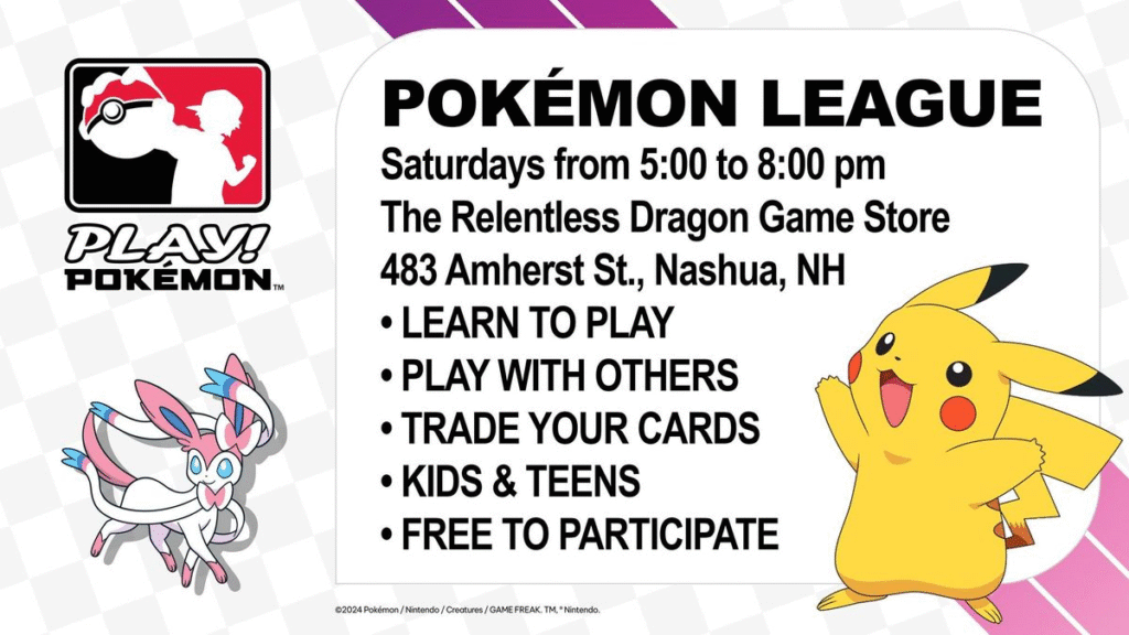 Pokemon League, Relentless Dragon, Nashua, NH โ Join us for weekly Pokemon League. This is a free event where kids of all ages (and adults!) can share their enthusiasm for the Pokemon Trading Card Game. Players can play, trade, socialize, or even learn how to play during League sessions. Promotional prize packs are awarded for participation in League. League meets every Saturday from 5 pm to 8 pm. Occasionally League sessions are supplemented by special events, such as Prerelease events, League Cups, and League Challenges. More info here.