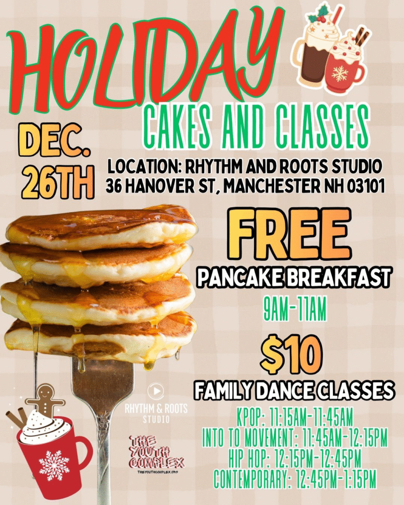 Holiday Cakes and Classes, Rhythm & Roots Studio, Manchester, NH โ Join us on Friday, Dec. 26 from 9 am – 11 am, for a cozy morning of community, movement, and fun at Rhythm and Roots Studio. Enjoy a FREE pancake breakfast and stick around for family dance classes starting at just $10. From K-pop to hip hop to contemporary, thereโs something for everyone. More info here.