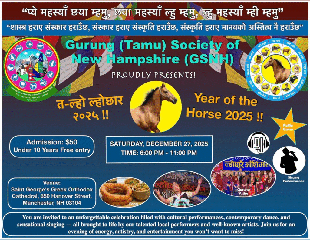Celebrating the Year of Horse!, Saint George’s Greek Orthodox Cathedral, Manchester, NH โ The Gurung (Tamu) Society of New Hampshire (GSNH) warmly invites you to our annual Lhochhar Celebration on Saturday, Dec. 27 from 6 pm – 11 pm, honoring our rich cultural heritage. This year, we are delighted to celebrate the Year of the Horse. The celebration is filled with Nepali cultural performances, contemporary dances, and sensational singing โ all brought to life by our talented local performers and well-known artists. Join us for an evening of energy, artistry, and entertainment you wonโt want to miss! More info here.