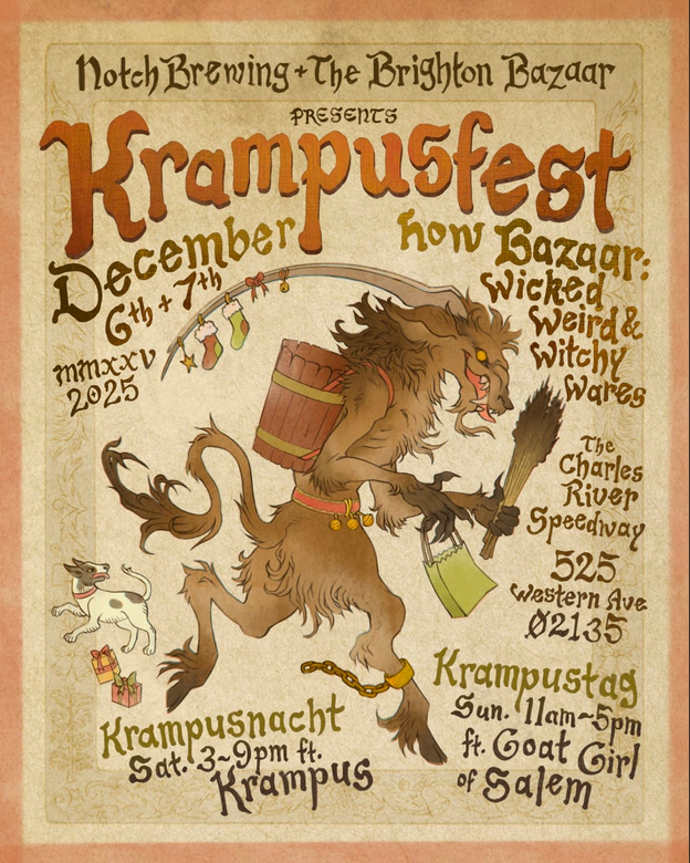 Krampusfest by Brighton Bazaar & Notch Brewing, The Charles River Speedway, Boston, MA โ In German folklore, Santa rewards the nice, while his associate Krampus punishes the naughty. On Dec. 6 & 7, Krampusfest celebrates this eclectic tradition at Boston’s most authentic German brewery, featuring Boston’s first & only dark Holiday market! Sat., Dec. 6 from 3 – 9pm: Krampusnacht w/ Krampus. Krampuslauf courtyard parade & costume contest on stage w/ prizes. Details TBA. Sun., Dec. 7 from 11 am – 5 pm: Krampustag w/ Goat Girl of Salem. Both days: 60+ vendors will pop up at The Charles River Speedway in Boston (525 Western Ave 02135) to sell wicked weird & witchy wares! More info here.